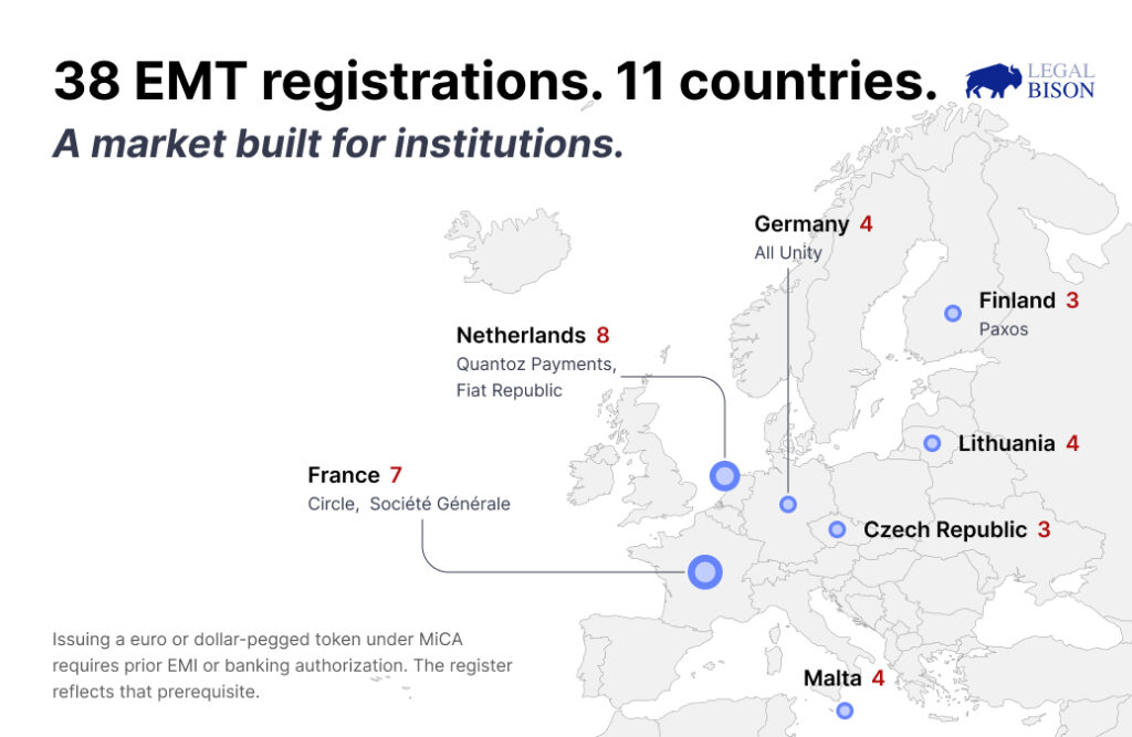 The concentration is the result of regulatory design. MiCA structured EMT issuance as an institutional product from the outset. Founders exploring fiat-pegged token issuance under MiCA are entering a market defined by banks and licensed payment institutions, not by startups.